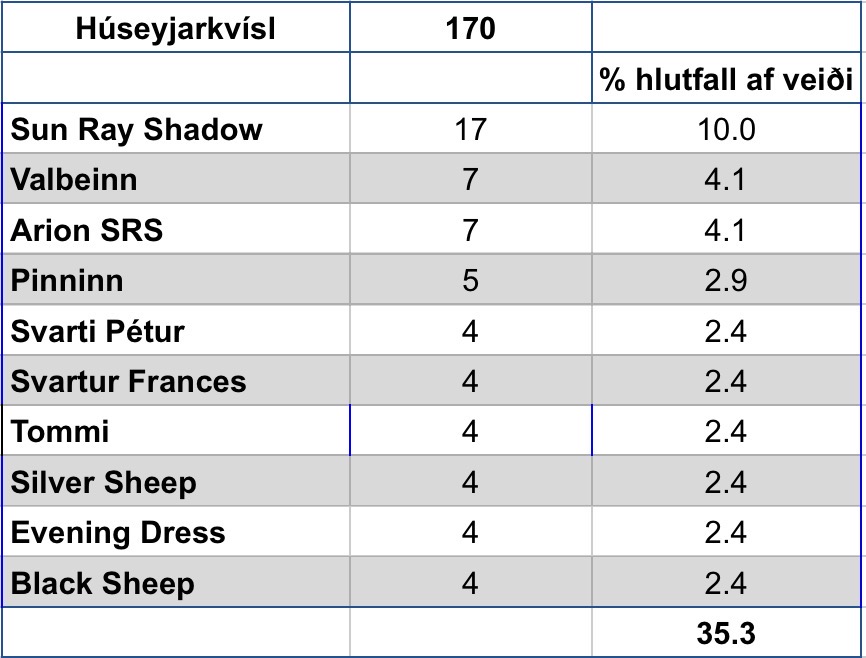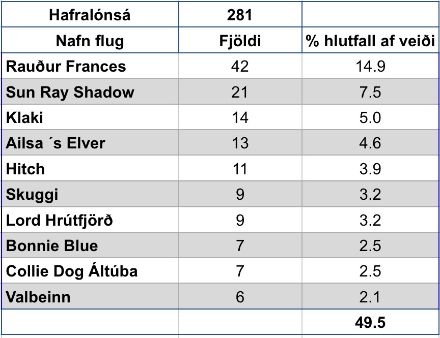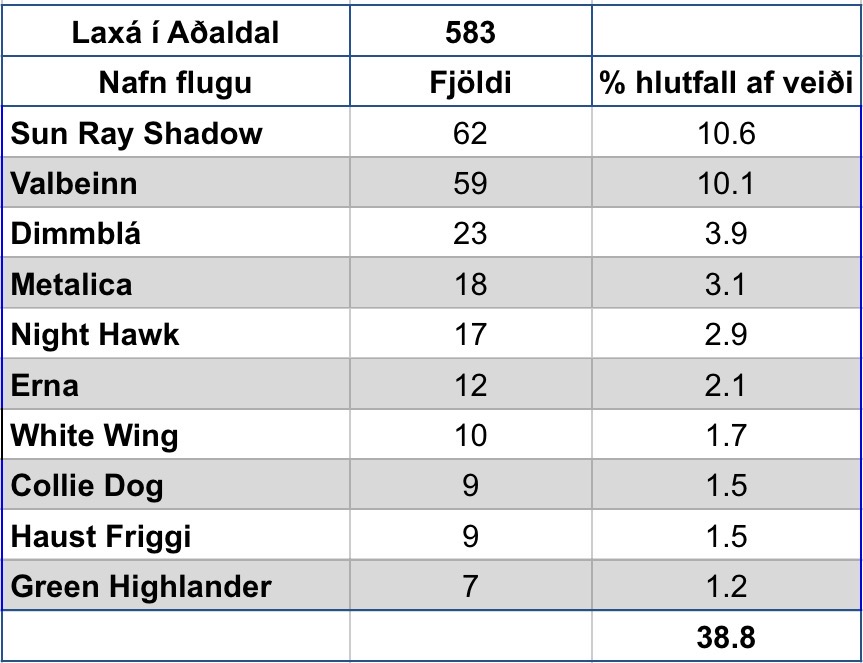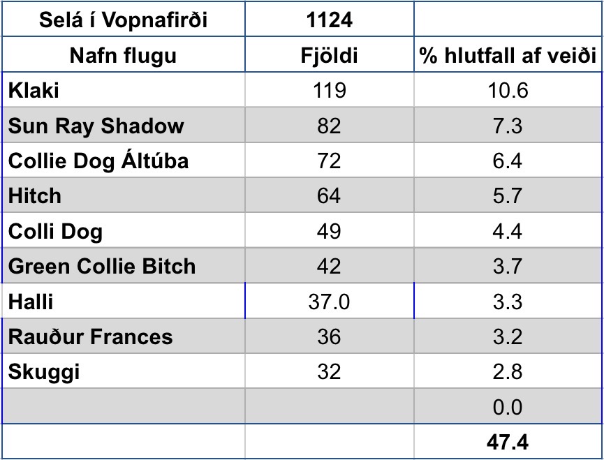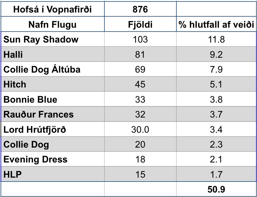 Þegar teknar eru saman tölurnar á þessu svæði þá sést að fluguvalið er allt annað en á hinum svæðunum sem búið er að taka saman. Er skemmtilegt að sjá að mynstrið á þessu svæði og hefur það sýnar skýringar. Við vinnslu þessarar samantektar var stuðst við viðmiðið að að veiðst hefði 150-200 laxar til að upplýsingarnar hefðu verið notaðar. Það vantar nokkrar ár og er það þá vegna þess að veiðtölur hafa ekki náð viðmiði eða viðkomandi á er ekki með samning við Angling IQ.