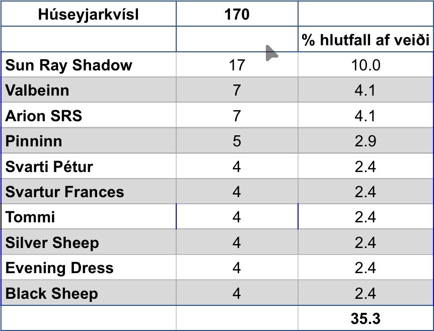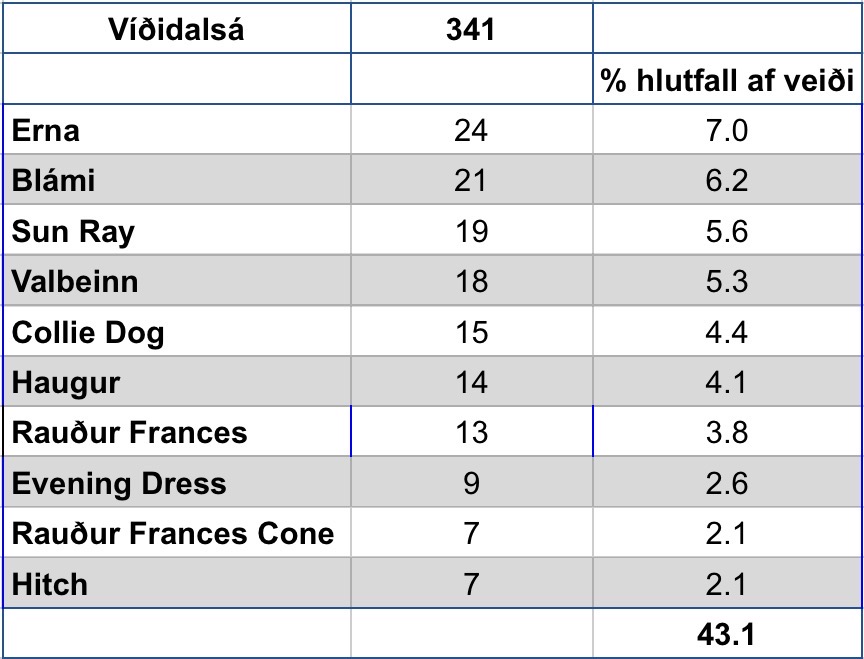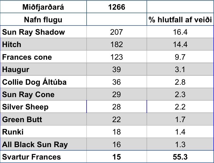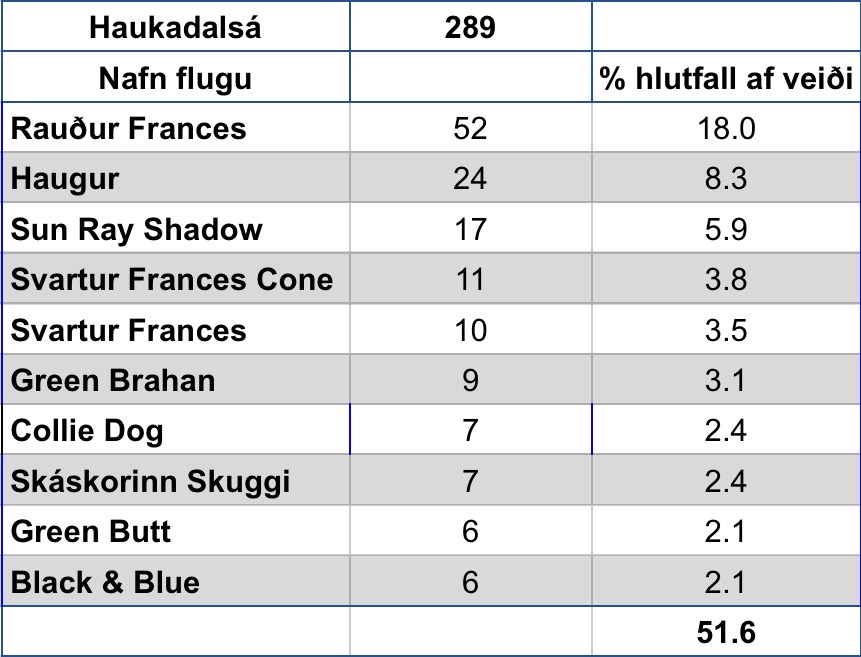 Þegar þetta svæði er skoðað þá breytist aðeins hvað flugur eru notaðar og hverjar ekki og því er munstrið aðeins öðurvísi en á hinum svæðunum sem búið er að taka fyrir. Hvorki Flekkudalsá né Blanda eru með í þessari úttekt og er það vegna þess að þar lá ekki fyrir nægilegt magn af veiddu fiski þannig að tölurnar yrðu áreiðinlegar. Í saman tektinni kemur fram að í Haukadalsá og Miðfjarðará gefa tíu sterkustu flugurnar yfir 50 af heildar veiðinni.