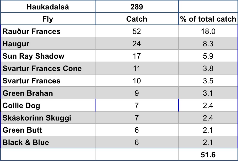 The data clearly shows that in rivers such as Haukadalsá and Miðfjarðará, the top ten flies account for over 50% of the total catch, highlighting how dominant a relatively small selection of flies can be.