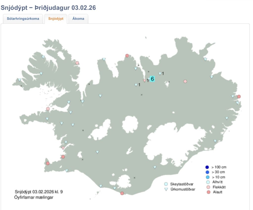 Á vef Veðurstofu Íslands sést að það er ekki mikill snjór á landinu og mjög víða er autt en einhver snjóþekja á sumum stöðum. Er þetta að eitthvað sem menn þurfa að óttast? Svar við þeirri spurningu er bæði já og nei. Það eina sem við getum vonað úr þessu er að það verði rigningar sumar árið 2026 og því verður þetta að öllum líkindum smáflugu sumar þetta árið eins og staðan er í dag. Sumarið kemur og hvernig það verður vitum við ekki en vonandi verður það okkur hliðhollt þ.e.a.s. rigningar sumar. Hvar er mesta hættan á þurrka sumri? Það er náttúrulega á Suðvesturlandi og Vesturland, en Norðurland og Norðausturland mun fara betur út úr sumrinu heldur en hin landsvæðin.
