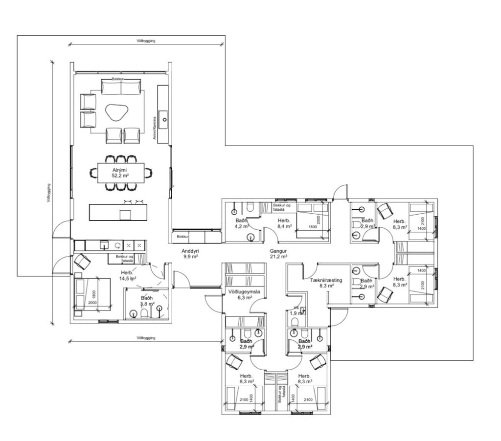 Eldri byggingin breytist þannig að það verða fimm með herbegi með sérbaði. Gengið verður inn í húsið milli álmanna og gerð hefur verið vöðlugeymsla þar sem gamla eldhúsið var. Í nýju ámunni er eitt nýtt herbegi með sérbaði og stórt alrými með eldhúsi sem snýr út að ánni.