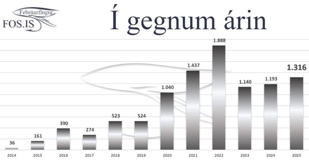 Eins og með fylgjandi mynd sýnir þá eru þetta magn þeirra flugna sem hnýtarar hafa birt á Febrúarflugum og sést að þetta framtaka vel sótt af þeim og sýnir einnig hvernig hópurinn hefur vaxið í gegnum árin.